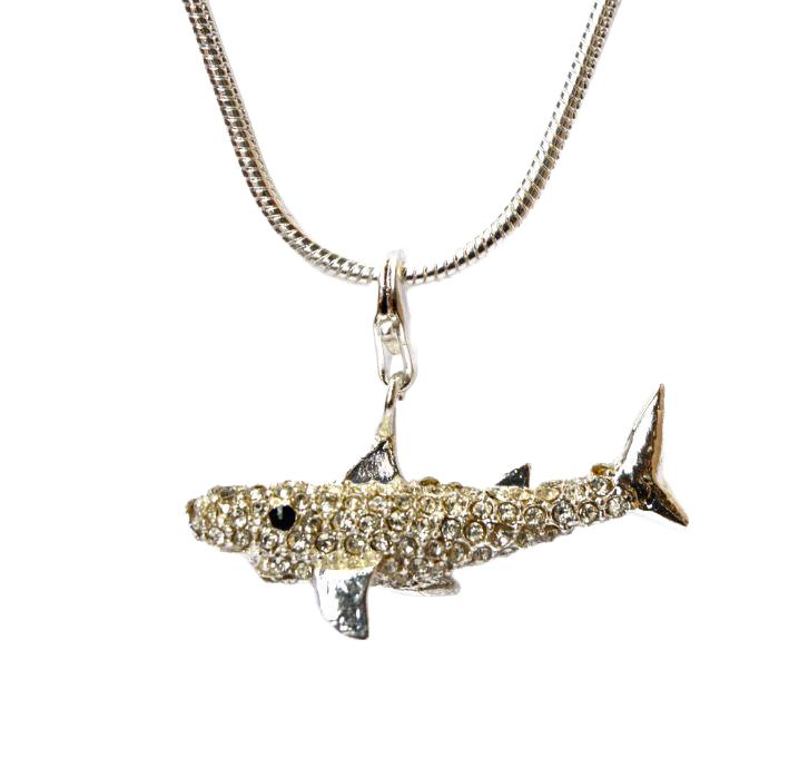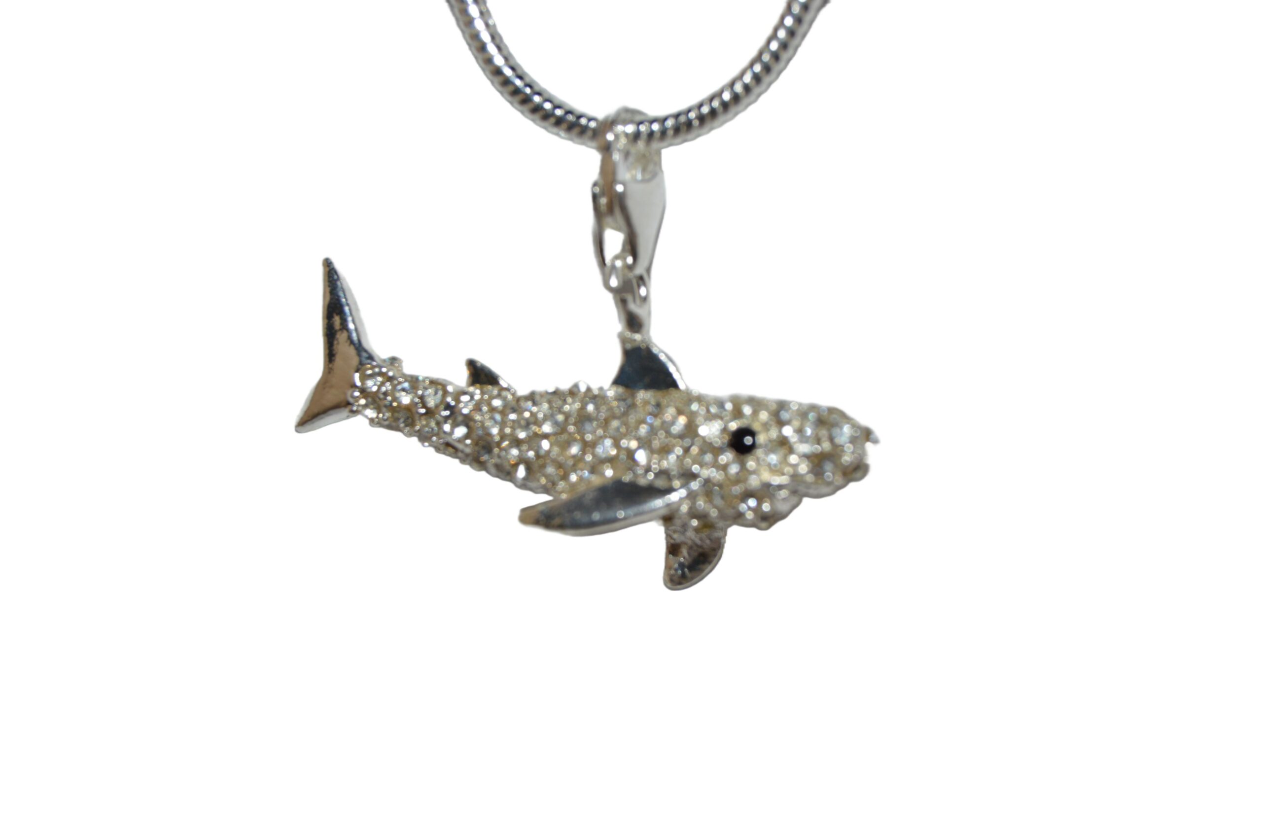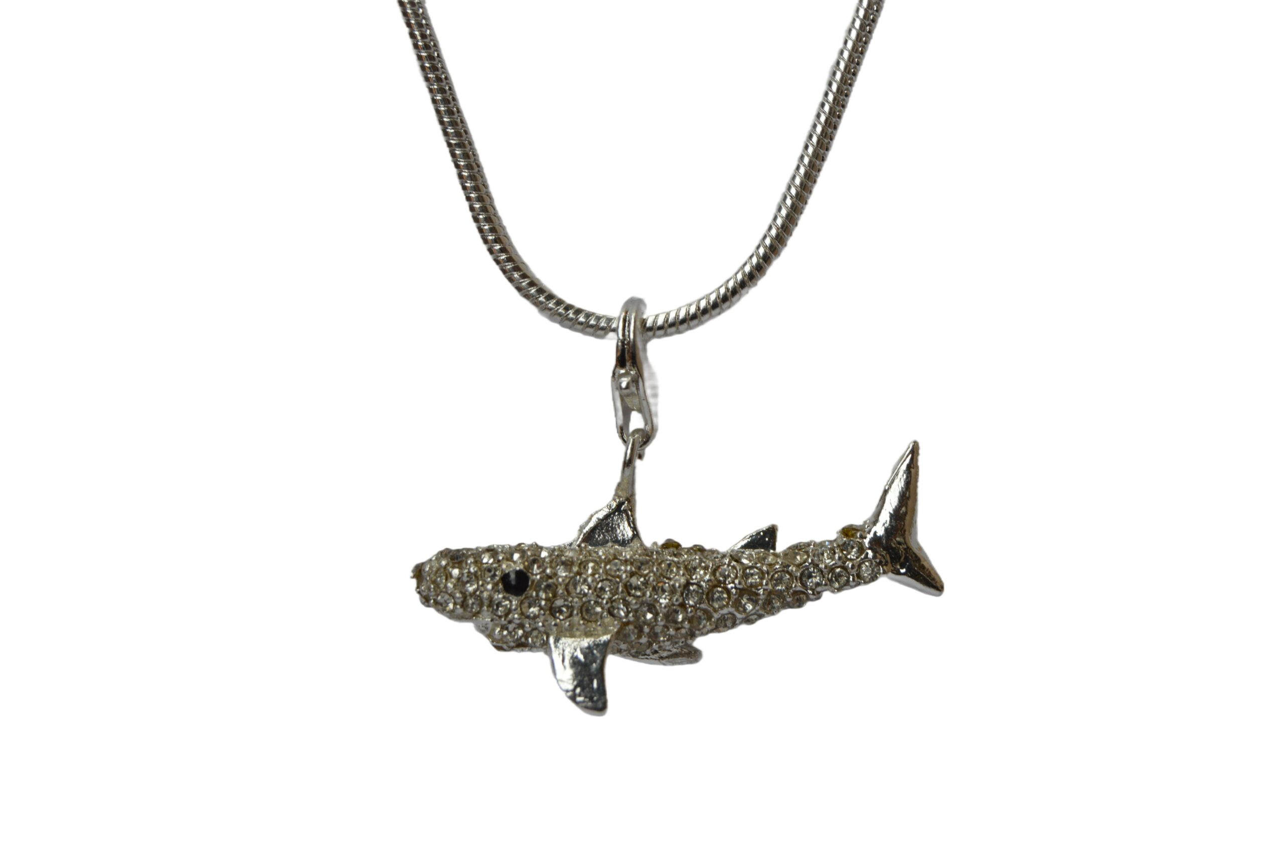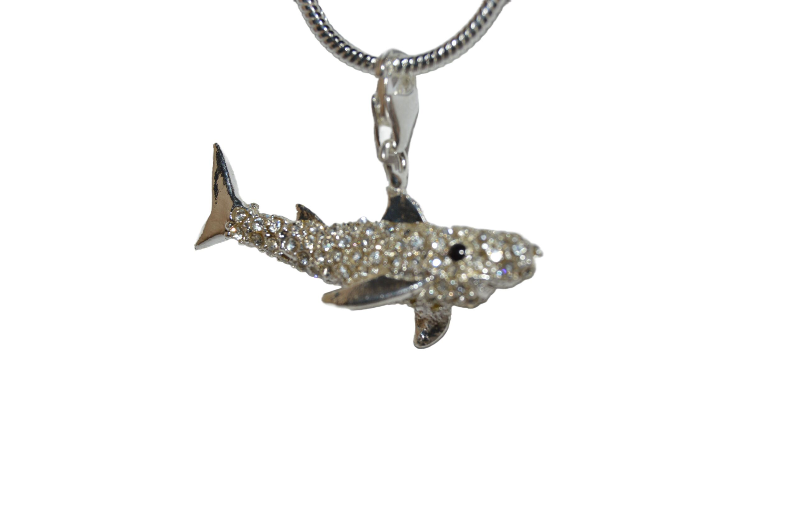 Zeigen Sie Ihren Biss mit diesem fabelhaften Hai-Anhänger! Dieses Stück ist mit funkelnden Steinen besetzt und ist bereit, Köpfe verdrehen zu lassen. Perfekt für den Strandgänger, den Hai-Liebhaber oder jeden, der ein einzigartiges und auffälliges Accessoire wünscht.